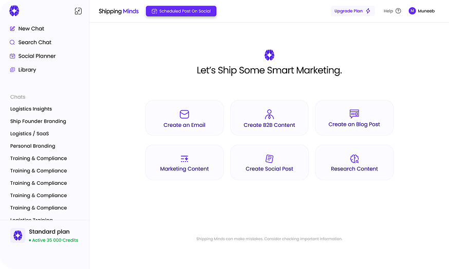 Shipping Minds was implemented as a centralized AI-powered content and shipping hub that brought strategy, creation, and scheduling into one system. The platform enabled the team to generate high-quality, brand-aligned content using AI, plan campaigns in advance